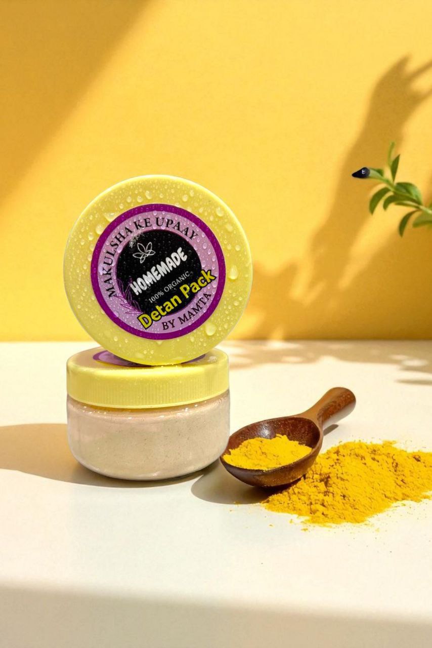 DeTan Pack is a gentle, handmade blend of Wild Turmeric (Kachhi Haldi) and Mulethi (Licorice) powder designed to reduce pigmentation, even out skin tone, and restore natural radiance. Just mix with water, apply, and rinse — no harsh chemicals, no added fragrance.